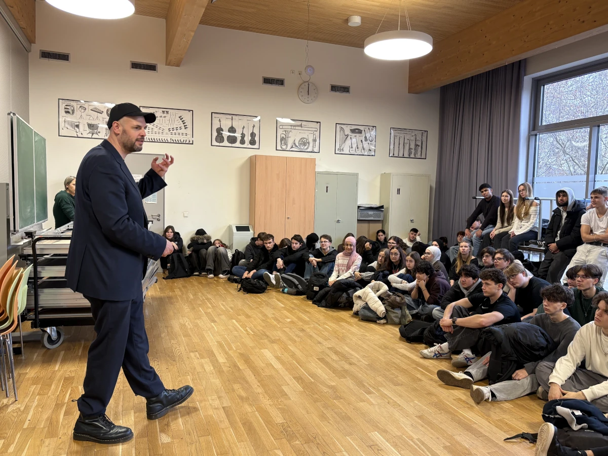 Die Veranstaltung der neunten Klassen und der MSS12 stellte dann allerdings eine unerwartete Herausforderung ganz anderer Art dar: Probealarm und Baulärm, die zuvor noch humorvoll in die Poesie eingeflossen waren, nahmen nun ein solches Ausmaß an, dass die Gruppe vom Musiksaal in M1 umziehen musste. Bas Böttcher bewies auch in dieser Situation seine Flexibilität und konnte sein Publikum trotz allem mit seiner Kunst fesseln. In dem kleineren Raum aus Platzmangel zum Sitzen auf dem Boden gezwungen, ergab sich für die Gruppe sogar ein wenig echte Poetry Slam-Atmosphäre. Und ganz nebenbei trat der Slammer so den Beweis an, dass er wirklich keine leise Literatur betreibt, sondern hohe Performanzkunst, die zugleich unterhält und nachdenklich stimmt.